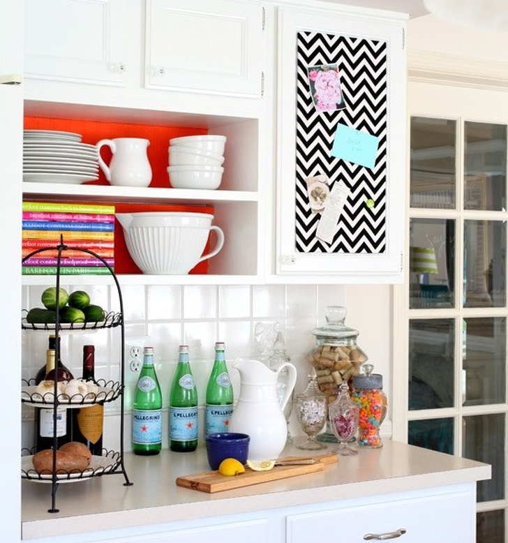 Білий шафа для посуду стане стильним і незвичайним, якщо пофарбувати задню стінку в яскравий колір, а на дверцята нанести чорно-білий візерунок.