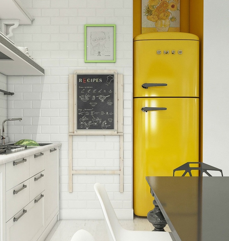 Жовтий холодильник привносить в кухонний інтер'єр живу і позитивну атмосферу. Він головний на цій кухні. Дизайн всієї квартири можна подивитися тут.