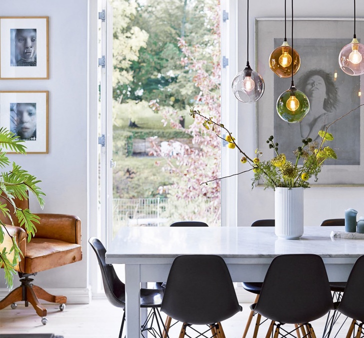 Напівпрозорі плафони з кольорового скла створюють в кухні святкову атмосферу.