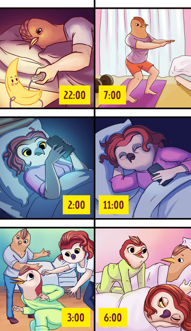 Social.org.ua провів власне дослідження і зафіксував найяскравіші моменти з життя сов і жайворонків, а потім уявив, як би це виглядало, якби вони були разом.