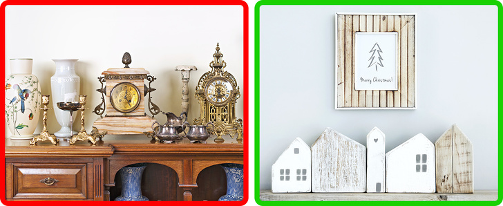 - Порожні полиці виглядають не дуже красиво. Але замість десятка маленьких дрібничок краще вибрати 1-2 середнього розміру і поставити їх в центр, залишивши краю вільними.