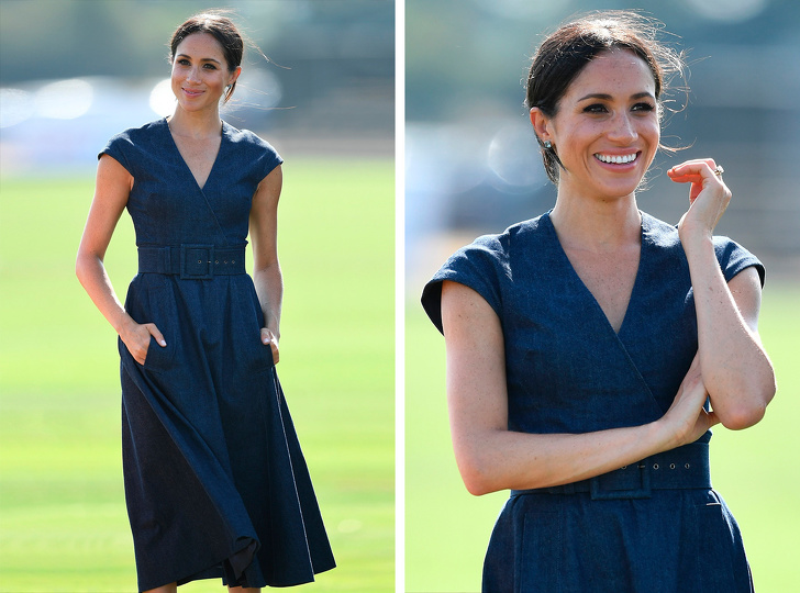 Навіть якщо ваша фігура далека від типу «пісочний годинник», підкреслити талію безперечно варто. Меган Маркл робить це як не можна краще з допомогою пояса і широкої спідниці. Такий хід, як і відкриті ключиці, робить образ більш жіночним і вишуканим, навіть незважаючи на те, що це конкретне плаття — з джинсової тканини.