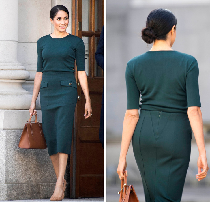 Герцогиня Сассекская любить носити великі сумки, і вона завжди підбирає їх так, щоб колір гармоніював з сукнею або костюмом. І темно-зелену сукню і коричнева сумка — ідеальне підтвердження.