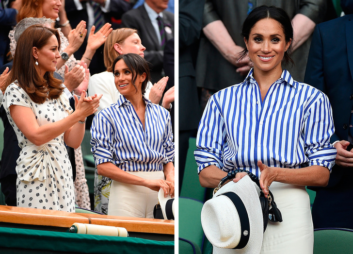 Одяг у стилі oversize ще популярна, але складно уявити, щоб члени королівської сім'ї дозволяли собі її надіти. Тим не менш герцогиня Сассекская іноді йде наперекір цим нормам. Приміром, надівши широку сорочку в смужку на матчі турніру уїмблдону. При цьому Меган Маркл, звичайно, зрівноважила її класичним низом і капелюхом, але від цього образ став лише ефектніше.