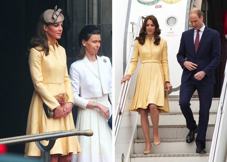 Це жовте плаття-пальто герцогиня вже одягала в 2012 році, а потім вибрала його ще раз для офіційного візиту в Бутан в 2016 році. У 2016 році наряд виглядає по-іншому завдяки відсутності капелюшки, інший укладанні, клатчу і прикрасам.
