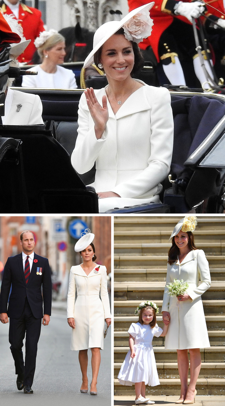 Це елегантне плаття-пальто герцогиня одягала як мінімум 4 рази: на хрестини принцеси Шарлотти в 2015 році, на парад на честь офіційного дня народження королеви в 2016-му, під час офіційного візиту в Бельгію в 2017 році і на весілля принца Гаррі і Меган Маркл в травні 2018 року.