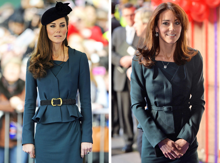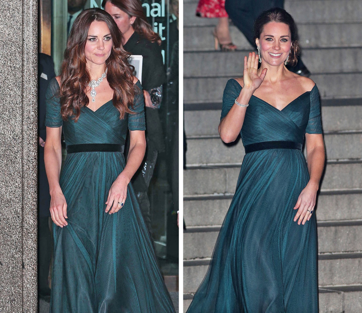 Вечірнє плаття часто вважають сукнею одного виходу. Однак з будь-якого правила є винятки: часом і герцогиня може дозволити собі одягти одне і те ж вечірнє плаття кілька разів, причому навіть протягом одного року, — за умови, що воно буде доповнено різними прикрасами. На фото зліва — лютий 2014-го, праворуч — грудень цього ж року.