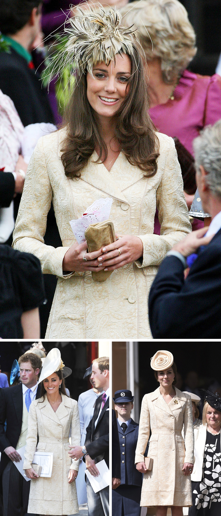 Це елегантне пальто — приклад того, що деякі речі Кейт Міддлтон носить ще з часів свого дівоцтва. Так, на фото вгорі Кейт була відображена на весіллі Лори Паркер-Боулз і Гаррі Лопеса в 2006 році. Тоді вона ще не була дружиною принца Вільяма і, відповідно, герцогинею. Згодом Кетрін з'являлася на публіці в цьому вбранні в 2011 році, а потім знову була помічена в ньому в 2016-му, тобто через 10 років з моменту першого виходу. Завдяки різним капелюшках, клатчам і прикрасам наряд щоразу виглядає дещо інакше.