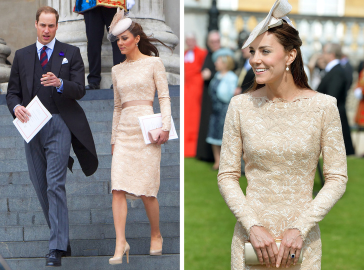 Стильне мереживну сукню герцогиня одягала на урочистий захід в 2012 році і знову звернулася до цього поряд вже в 2014-м. Акцент у вигляді пояса на талії, різні капелюшки і клатчі — і наряд вже не буде колишнім.