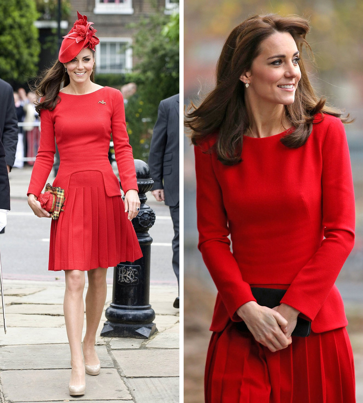 Це ефектне червона сукня Кейт також одягала неодноразово. Образи герцогині відрізняються різними клатчами і тим, що в одному випадку є капелюшок і брошку, а в іншому немає.
