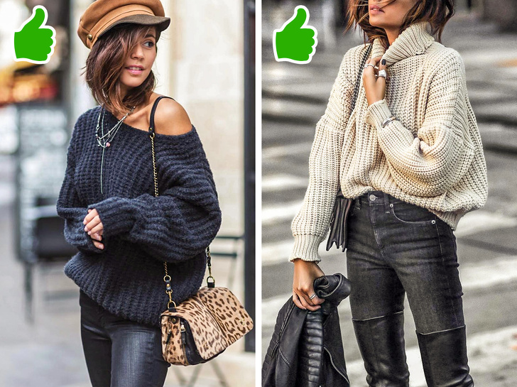 Светр-oversize великої в'язки здатний додати обсяг верхньої частини фігури, а значить, і збільшити груди. В цілому будь-які «пухкі» фактури візуально збільшують форми.