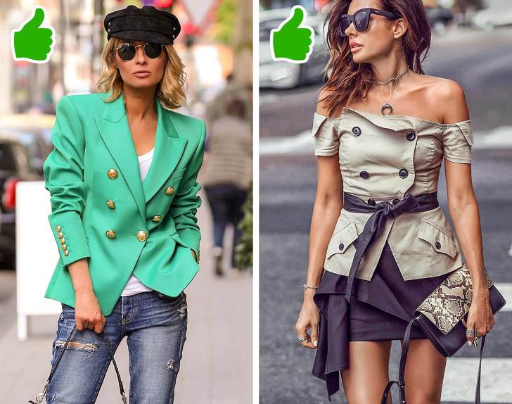 Двобортні жакети, пальто, сукні мають властивість не тільки збільшувати обсяг грудей, але і злегка повнити, візуально розширюючи верхню частину фігури. Тому такий прийом краще використовувати худеньким і струнким дівчатам, які не бояться трохи «погладшати».