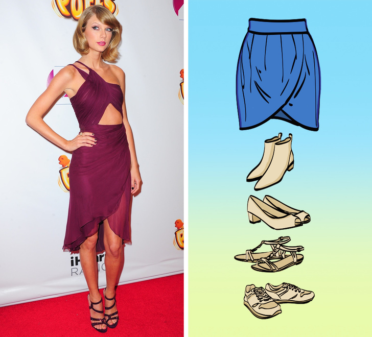 На відміну від попередніх типів, розкльошені до спідниць підходить не так вже багато моделей взуття. Найголовніше, на думку стилістів, — наявність підборів. Причому каблук не повинен бути низьким або дуже масивним.
