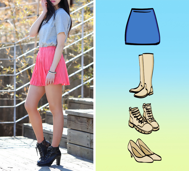 З шкіряними міні-спідницями відмінно поєднуються високі важкі черевики на шнурівці: вони зроблять образ бунтарським і рок-н-рольним. Якщо спідниця ближче до класики, вибирайте однотонні акуратні чоботи на підборах.