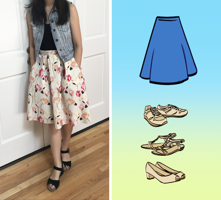 Розмір каблука допустимо варіювати: чим вищий зріст, тим він може бути менше. А рослі і досить стрункі дами цілком можуть собі дозволити носити спідницю А-силуету і з кросівками на танкетці.