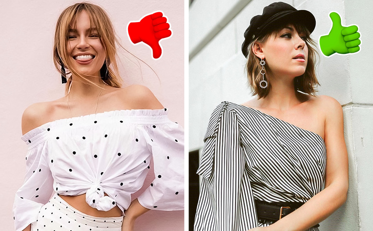 Можна спробувати замінити такий одяг сукнями і топами на одне плече. Вони теж покажуть всю красу ваших ключиць і підкреслять довгу шию, але дискомфорту в них значно менше. Ще один варіант — одяг з широким круглим вирізом. Вона все ще тримається на плечах, але при цьому теж відкриває область ключиць і шию.