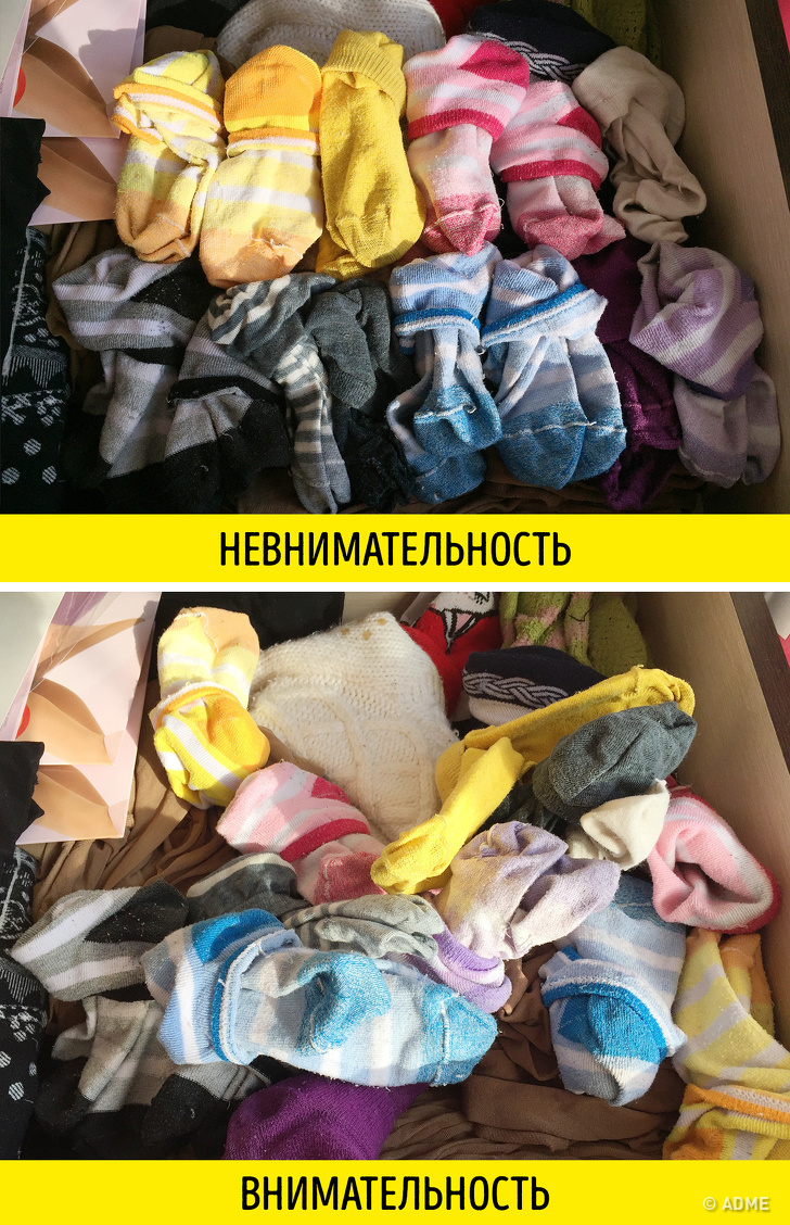 - Бардак в ящику з шкарпетками — уважність до деталей. Такий зв'язок може здатися нелогічним, але дослідження американського антрополога Хелени Фішер довів, що люди, уважні до дрібниць, найчастіше в ящику з шкарпетками мають цілковитий хаос.
