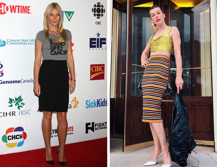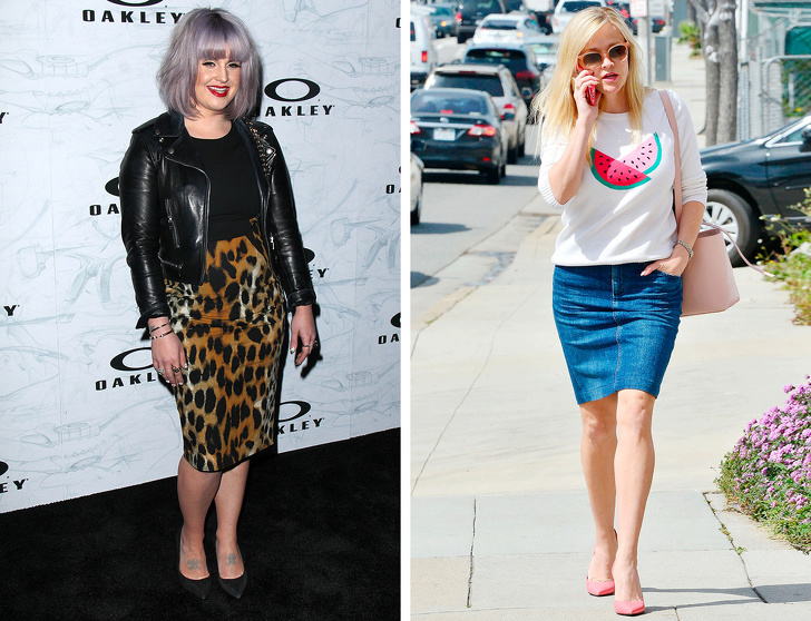 Тип фігури «груша» — це широкі стегна при вузьких плечах і тонкої, іноді заниженою талії. Врівноважити і візуально витягнути низ «грушевидному» типу допоможе спідниця-олівець прямого крою. Хоча деякі зоряні власниці такої фігури з гордістю носять вузькі спідниці, підкреслюючи різницю між плечима і стегнами.