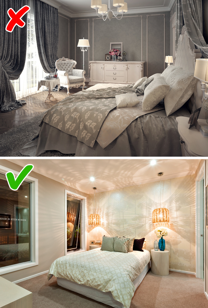 Щільні штори темних відтінків забирають світло, візуально зменшують простір і збирають пил. Згадайте, як просторо виглядає кімната, коли ви знімаєте гардини, щоб випрати їх. Пропонуємо в черговий раз зняти їх і відправити в машинку. І більше не вішати. Ви отримаєте більше додаткового світла і простору — саме те, що так необхідно в умовах маленької кімнати. Для захисту від яскравого сонця і сторонніх очей можна використовувати легкі, невагомі штори.