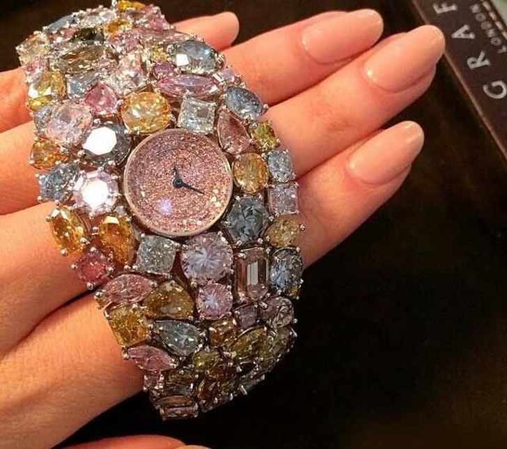 Жіночі годинники Hallucination, створені лондонській алмазно-ювелірною фірмою The Graff, покриті калейдоскопом з 110-каратних рідкісних кольорових діамантів у леденцово-цукеркової панелі. Це діамантове диво — плід дизайнерської думки самого засновника фірми Лоуренса Граффа, який заявляє, що ці годинники — скульптурний шедевр, святкування дива кольорових алмазів. Повідомляється, що на роботу над годинником пішло кілька тисяч годин часу.