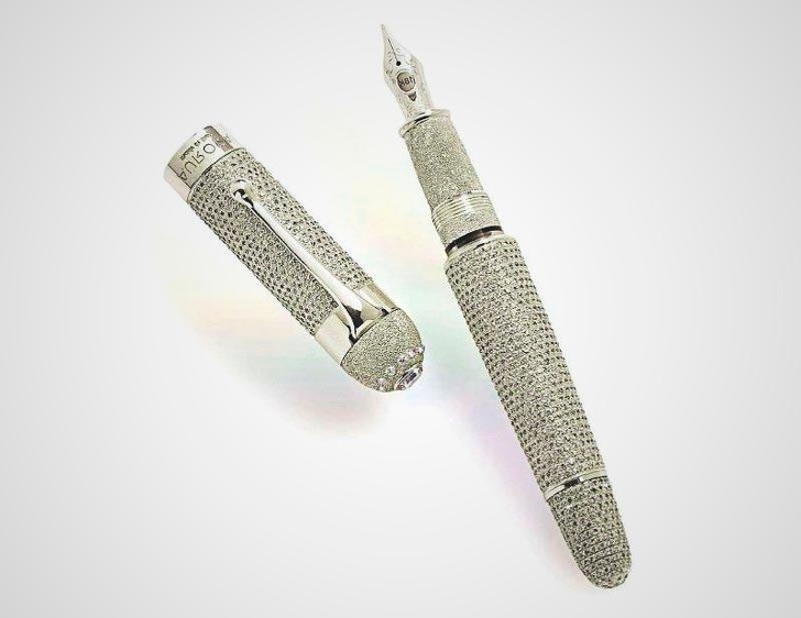 Ручка-перо від італійського бренду Aurora усипана 2 000 мініатюрних діамантів De Beers, загальна вага яких становить 7,5 р. Також основними матеріалами найдорожчою ручки-пера виступають платина і біле золото. Ручки виготовляються одиничними екземплярами, покупець може замовити гравіювання тексту або навіть портрета. Не дивно, що цей письмовий прилад можна по праву вважати ювелірною прикрасою будь-якого робочого столу.