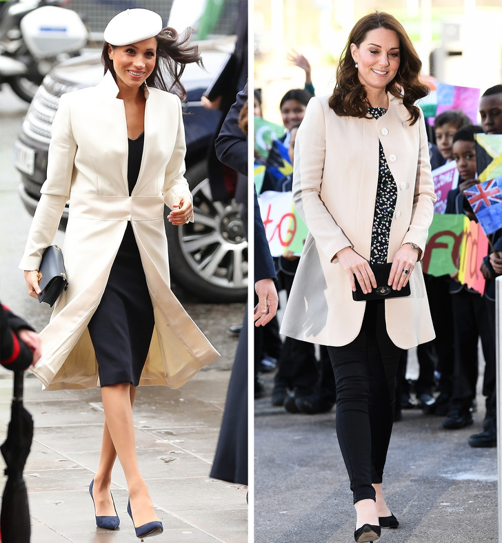 Пальто мерехтливої кольору — улюблений предмет гардероба багатьох дівчат у всьому світі. Така річ виглядає елегантно і жіночно. Не дивно, що її оцінили і представники королівської сім'ї. Даний варіант вдало виглядає на будь-якій фігурі: і тонка талія Меган, і кругленький животик вагітної Кейт виглядають в такому пальто однаково добре.