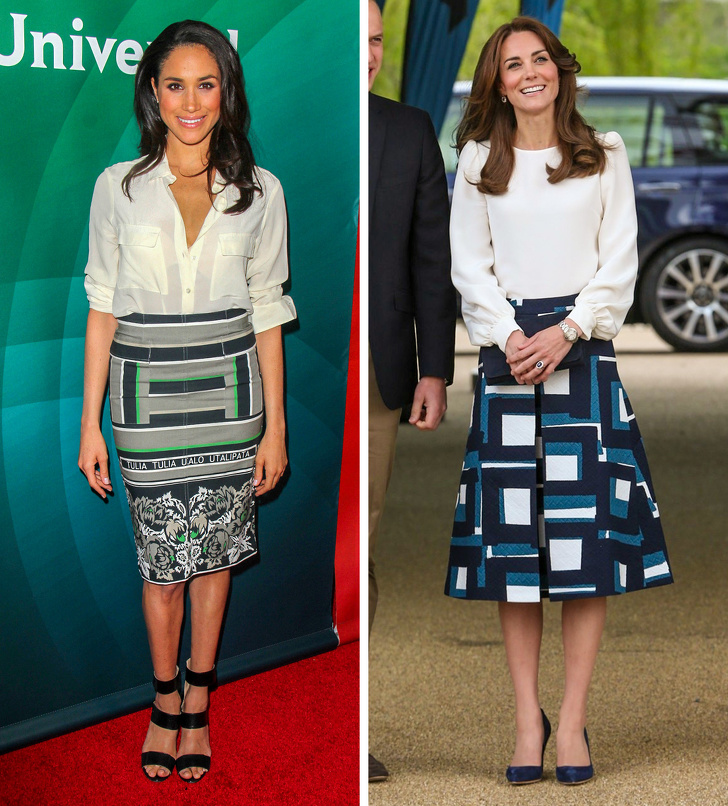 Геометричні форми вдало розбавляють нудну класику. Такий принт нерідко зустрічається в нарядах Кейт і Меган. При цьому герцогиня Кембриджська традиційно вибирає спідниці і сукні А-силуету довжини міді, прикривають коліна, а герцогиня Сассекская вірною коханому приталеного крою.