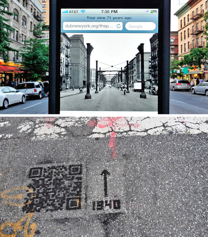 У Нью-Йорку можна побачити, як виглядали вулиці 70 або 80 років тому. Досить встати поруч зі стрілкою, зчитати QR-код, і зображення на екрані смартфона не сполучиться зі старою фотографією цього місця.