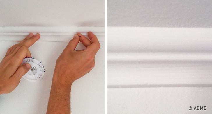 Якщо пофарбувати полістиролові стельові плінтуси в той самий колір, що й стеля, вони виглядають вже не так «пластиково». Ми клеїли плінтуси втрьох, у всіх затекли руки, а потім ми дізналися, що для того щоб вийшов ідеальний кут, необов'язково довго і наполегливо тримати його руками, можна скріпити його англійськими голками.