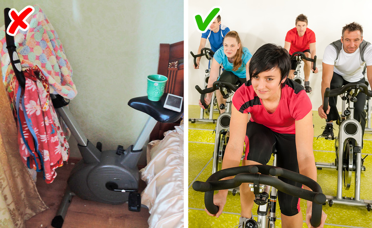Твердо вирішили зайнятися спортом? Не поспішайте купувати супермодний кардиотренажер. Досвід показує, що в більшості випадків він припадає пилом на балконі або в кімнаті, ставши своєрідним втіленням докору до самого себе. Якщо хочете перевірити свій ентузіазм, запишіться на місяць у спортзал.