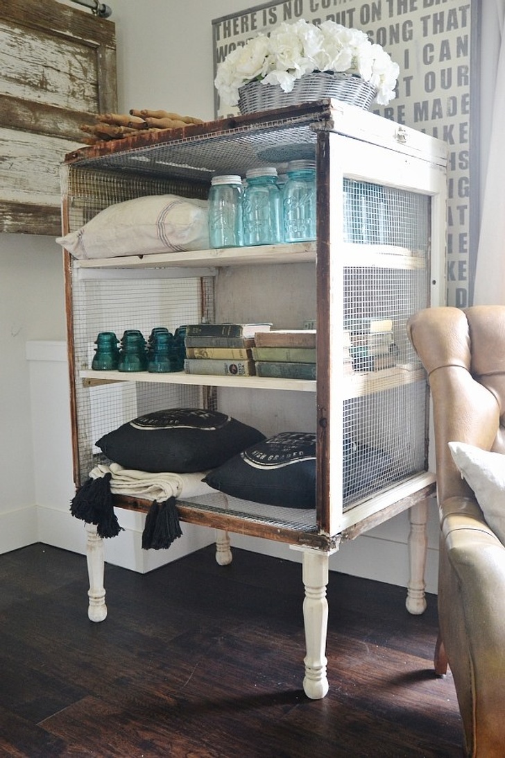 Не поспішайте викидати старі віконні рами після ремонту. З дерев'яних рам і прийшли в непридатність москітних сіток можна виготовити ось такий витончений ретростеллаж.