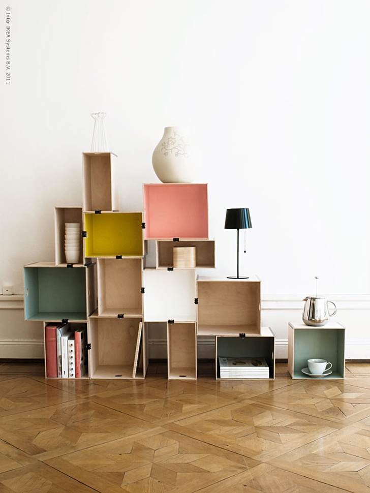 Цей стелаж зібраний з коробок для зберігання, сполучених канцелярськими затискачами, а особливу чарівність йому надають ніжні пастельні кольори. Захотілося оновити інтер'єр? Досить поміняти секції місцями.