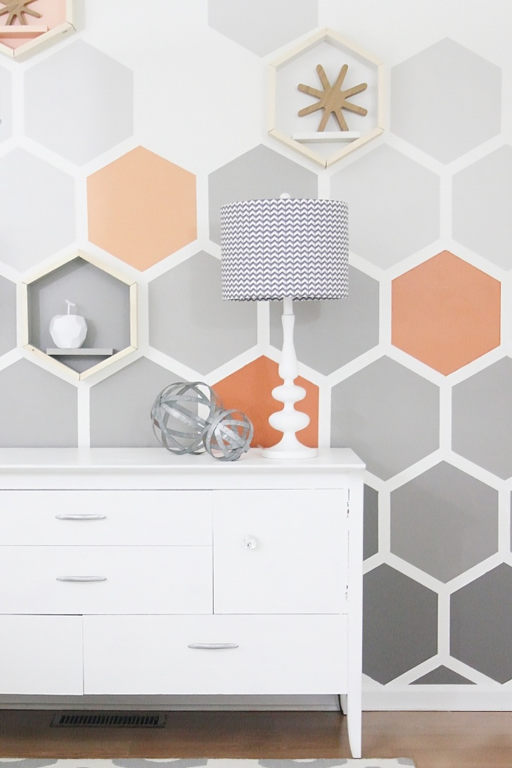 Вміло підібрані кольори плюс стильні полички-шестикутники — і ефектна стіна готова.
