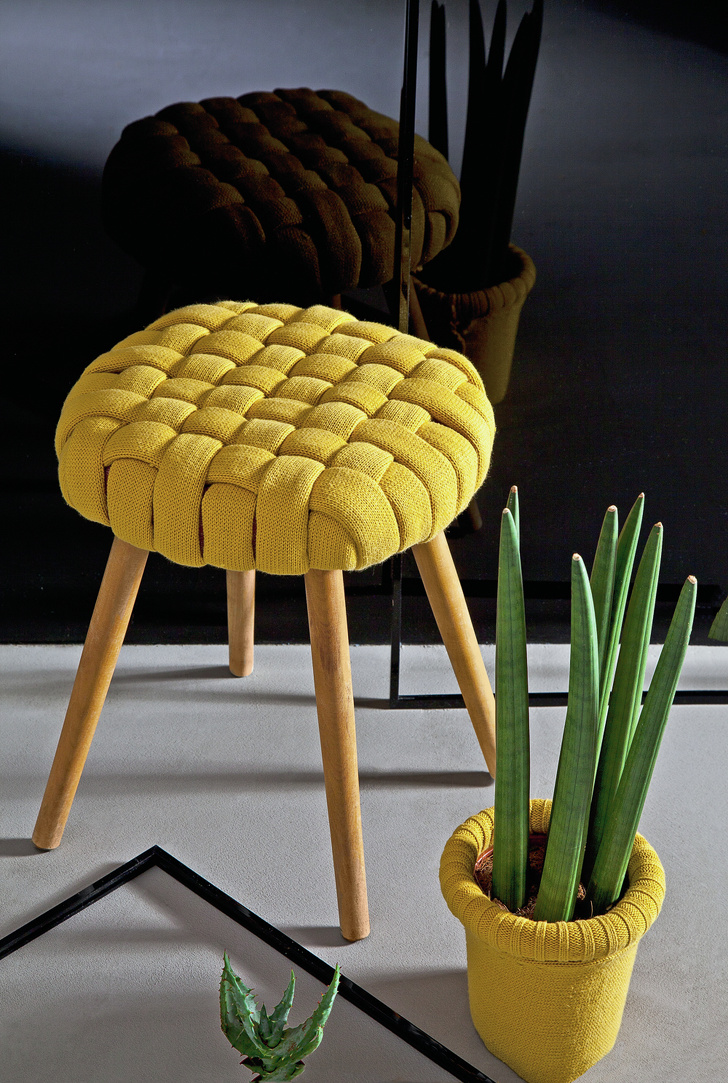 Оновити оббивку стільця або табурета можна за допомогою старого светра, а залишками матеріалу — прикрасити квітковий горщик.