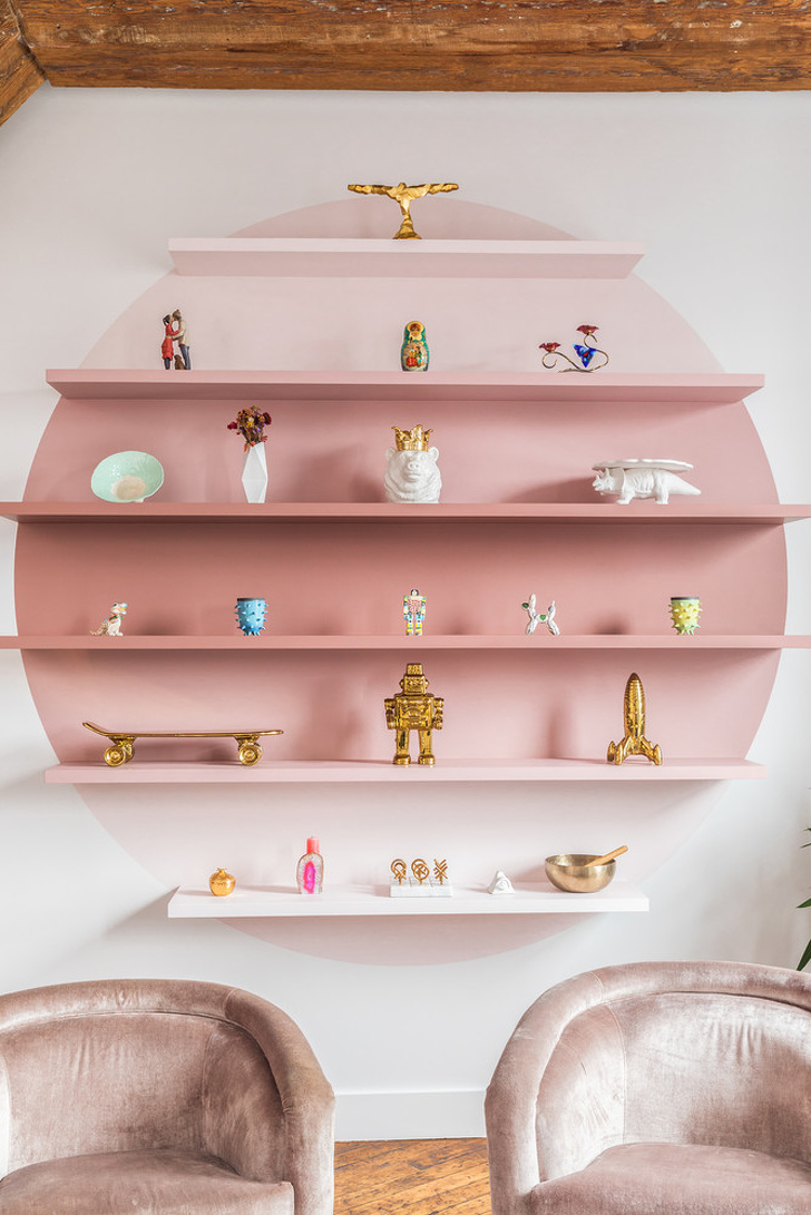 На ці полки так і хочеться поставити все найулюбленіше: нагороди, сувеніри або дорогі серцю колекцію фігурок супергероїв. При цьому кольорова пляма на стіні не виглядає недоречно завдяки гармонійному поєднанню відтінків.