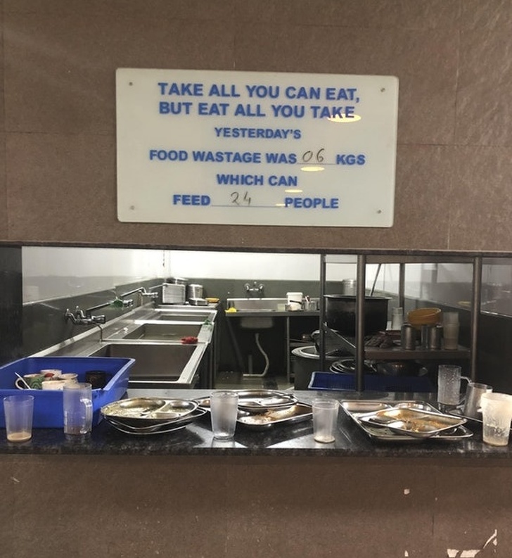 Напис в їдальні: «Візьміть усе, що зможете з'їсти. Але з'їдайте все, що берете. Вчора ми викинули 6 кг їжі, якої вистачило б, щоб нагодувати 24 людини»