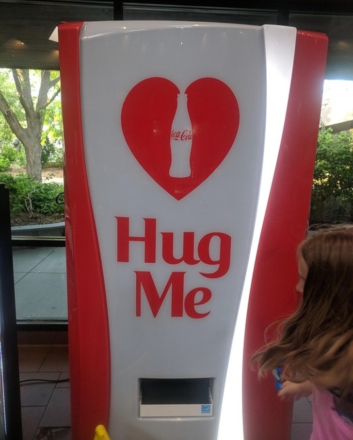 Напис на автоматі: «Обійми мене». Щоб отримати безкоштовну пляшку коли, потрібно просто обійняти автомат