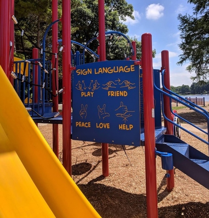 На цій ігровому майданчику встановлений знак, допомагає спілкуватися з дітьми, у яких проблеми зі слухом