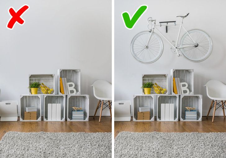 Навіщо ховати велосипед-на балконі або в передпокої, де він тільки заважає? Чому б не принести «залізного друга» в вітальню і не зробити його центром інтер'єру? Такий спосіб зберігання відобразить вашу активну життєву позицію. Можна знайти найпростіші і недорогі кріплення для стіни. А для найсміливіших є варіант підвісити велосипед під стелею. У будь-якому випадку така прикраса інтер'єру нагадає вам про теплих днях і велопрогулянках краще будь-яких фотографій.