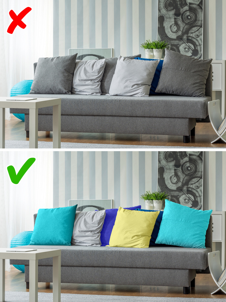 Найпростіший спосіб відновити звичний інтер'єр — поміняти наволочки у подушок або купити нові. Вибирайте контрастні кольори тканини, тоді кімната точно зміниться. Цей же секрет стосується всього текстилю в будинку: поміняйте штори, скатертини або покривала.