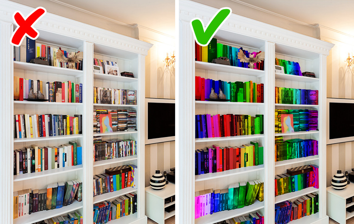 Організуйте вашу домашню бібліотеку заново: переставте улюблені книги за кольором обкладинок. Причому міняти експозицію можна за настроєм, згідно райдужного спектра або по градієнту. Така невелика перестановка відразу ж оживляє інтер'єр і впорядковує простір. Зрозуміло, далеко не у всіх обкладинок яскраві кольори, тоді можна обернути їх в кольоровий папір, заодно оновити старі обкладинки. Ваші шафи будуть виглядати по-новому.
