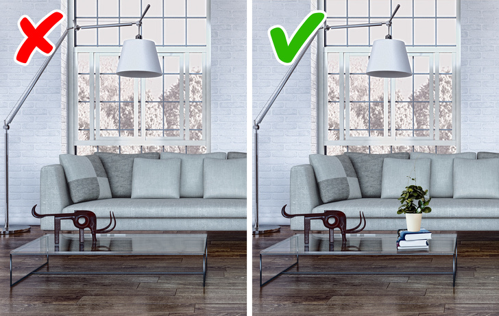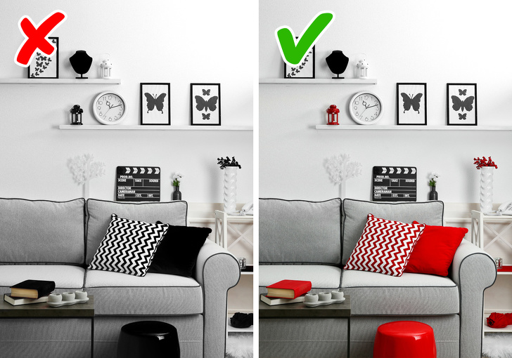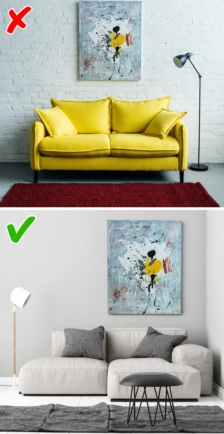 Багато звикли вішати картини або фотографії рівно по осі дивана або ліжка. Однак це не робить вашу квартиру унікальною. Озирніться: у вашій квартирі розвішані по осі картини виглядають справді нудно. Просто повісьте рамки трохи збоку і нижче звичайного: асиметрія буде виглядати виграшно, а інтер'єр заграє по-новому. Щоб перетворити звичайний інтер'єр у дизайнерський ставте або вішайте картини нижче і ближче до краю.