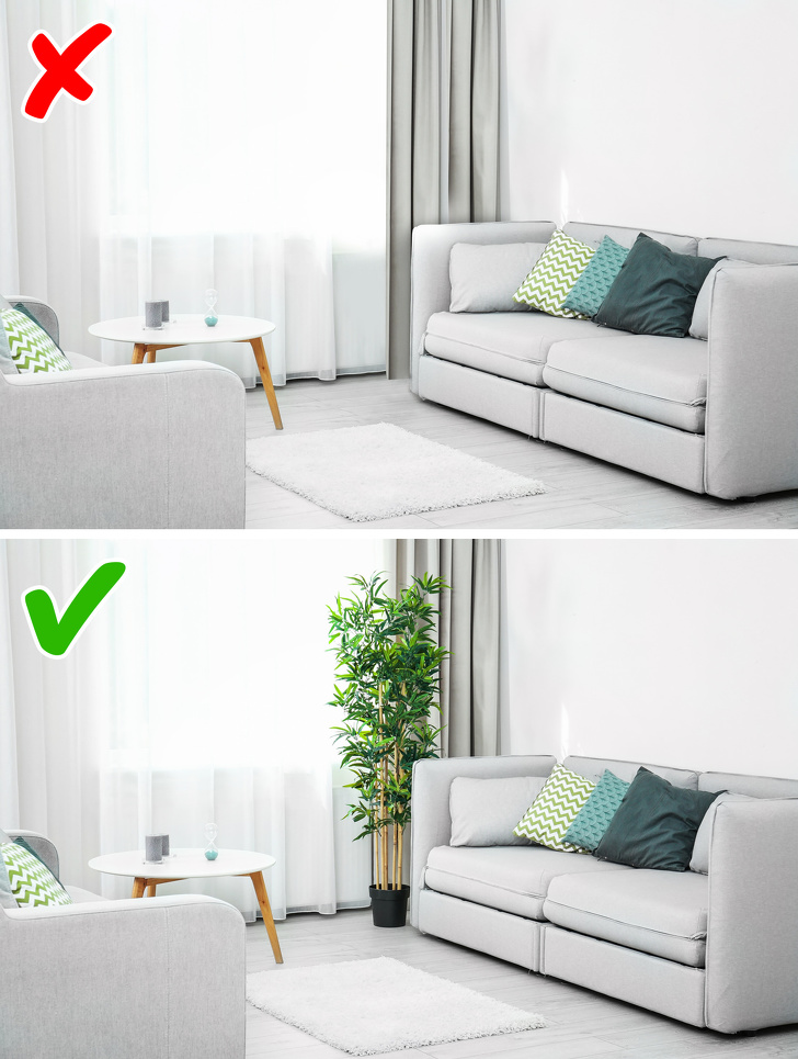 Ми звикли розміщувати рослини на підвіконнях. Проте ставити квіти на підвіконня — спірна ідея, тому що в кімнаті може стати темно, особливо якщо рослини великі. Якщо у вас є порожній кут в кімнаті, сміливо поставте туди ваша улюблена рослина. Краще, якщо воно буде об'ємним, тоді воно відразу впишеться в інтер'єр. Вибирайте невибагливі рослини, щоб менше часу витрачати на догляд, приміром фікус ліровидний або монстеру. А якщо слідувати феншуй, бамбук покращує атмосферу в приміщенні, тому можна поставити вазон з бамбуком в будь-який кут кухні. До того ж для великої рослини можна вибрати гарний об'ємний горщик, який також стане прикрасою інтер'єру.