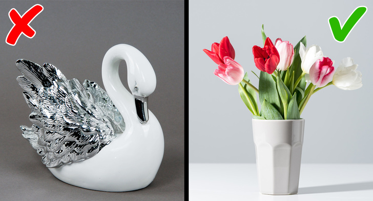 Ставити на полички фарфорових голубів, лебедів, жаб для залучення грошей та інші прикраси — минуле століття. Якщо вам хочеться додати деталей, які прикрасять ваше приміщення, поставте в кімнату вазу з квітами. Вона буде чудово виглядати, приємно пахнуть і не накопичить на собі вікову пил.