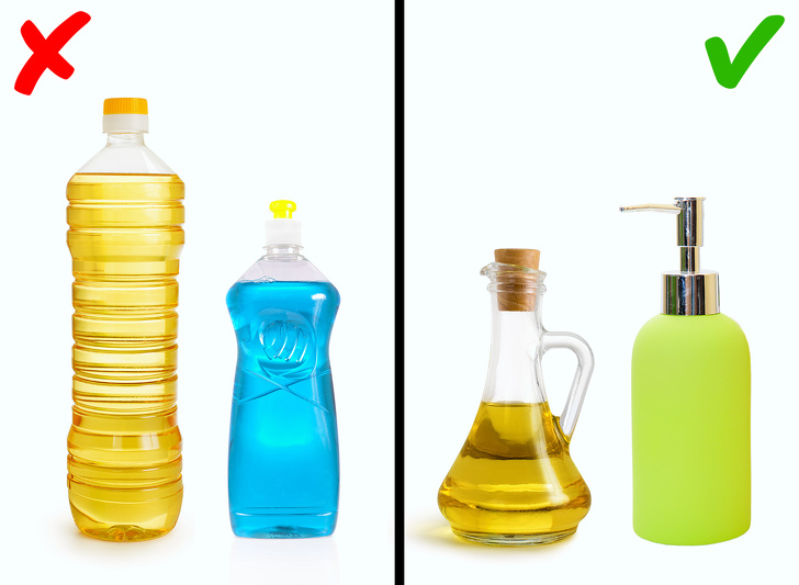 Чистячі засоби у ванній, спеції і упаковки з продуктами на кухні — ще одна проблема багатьох. Це ті речі, які завжди повинні бути під рукою, і не купувати їх точно не вийде. Вихід один: переливати і пересипати їх в красиві, підібрані до інтер'єру дозатори і контейнери.