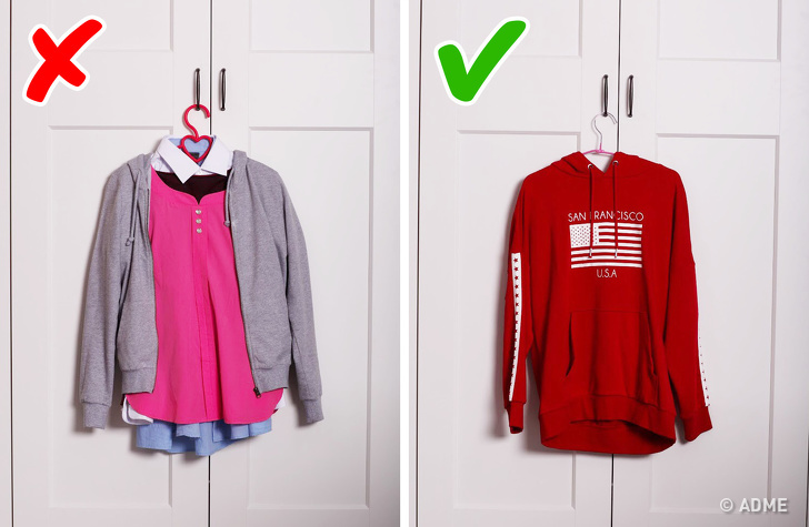 Придбайте якісні вішалки, щоб на одних плечах у вас не висіло по десятку речей. Можливо, проблема «нічого надіти» виникає саме тому, що про половину речей ви просто забуваєте, адже вони ховаються під іншими.
