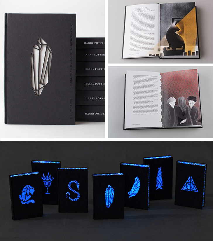 Студентка з Норвегії Кинчо Надь (Kincső Nagy) придумала і втілила в життя незвичайне оформлення книжок про знаменитого чарівника: на мінімалістській обкладинці кожної книги — елемент, що символізує предмет або артефакт з конкретної книги. Форзац покритий флюоресцентом, завдяки чому символи світяться. Також в книгах незвичайні ілюстрації — деякі з них об'ємні і рухливі.