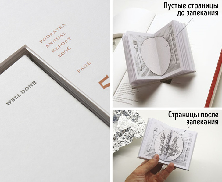 Для людини, не знайомої в концепцію бренду, книга порожня. А ось будь-який знавець підкаже: свої буклети Podravka друкує спеціальними термореактивними чорнилом. Для того щоб проявився текст, потрібно загорнути книгу у фольгу і запікати при 100° протягом 25 хвилин. Будьте обережні: якщо ви помилитеся з температурою або часом, буклет просто згорить. А якщо все вдасться, сторінки заповняться текстом та ілюстраціями з їжею.