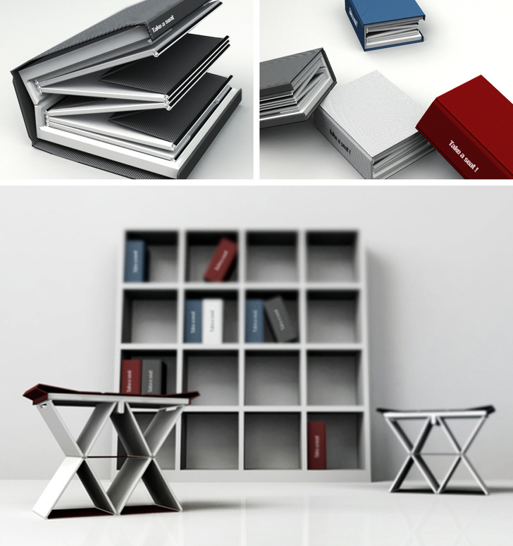 «Відкрийте книгу, візьміть крісло». Його, до речі, теж можна взяти прямо з книжкової полиці: така концепція книги-стільця від дизайнера Дэрриса Хэмроуна (Darris Hamroun). А що, цілком зручно.