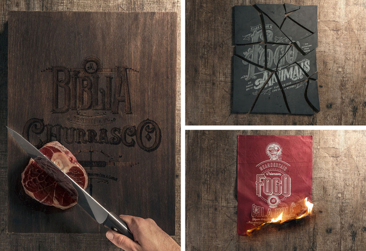 А як щодо такого варіанту? Книгу випустили дизайнер Лукас Рейс (Lucas Reis) і бразильська компанія-виробник професійних кухонних ножів. І вся вона про те, як приготувати бразильське національне барбекю чурраско: в ній є рецепт, а також все, що потрібно для його приготування (сторінки: вугілля, сіль, фольга, сторінка-для заточування ножа, сторінки для роздування вогню і розпалювання, а ще фартух, скатертину і навіть серветка під прилади).